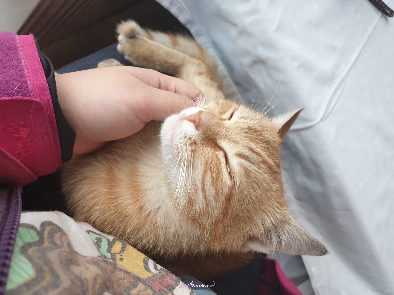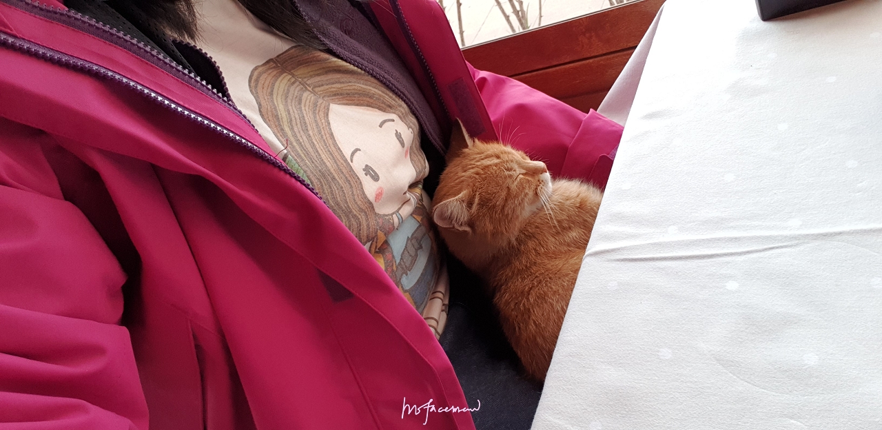 有店員看到它走過來看我這邊,我就問了一下是店裡的貓嗎?店員搖頭,但是我捨不得吵醒睡覺的小橘貓,假裝在上網跟喝咖啡,店員不時過來看我一下 而小橘貓就這樣躺在我懷裡睡了一小時!!!