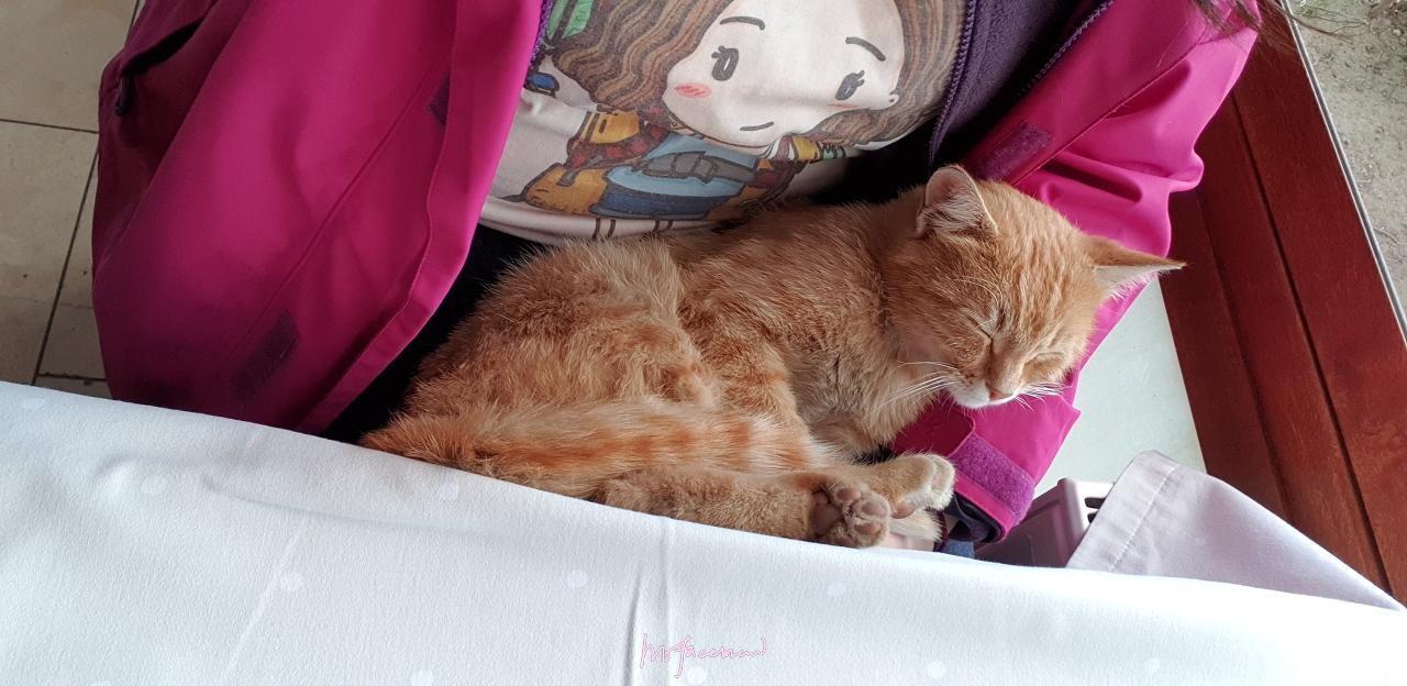 最後小橘貓醒來後,我等他自己下床(?),就起身準備離開回旅館,只見店員全部跑來拍坐在椅子上的小橘貓,男店員用非常溫柔的方式把小橘貓架出去(真的是用架出去的XD)