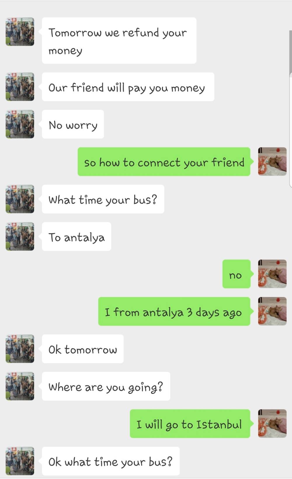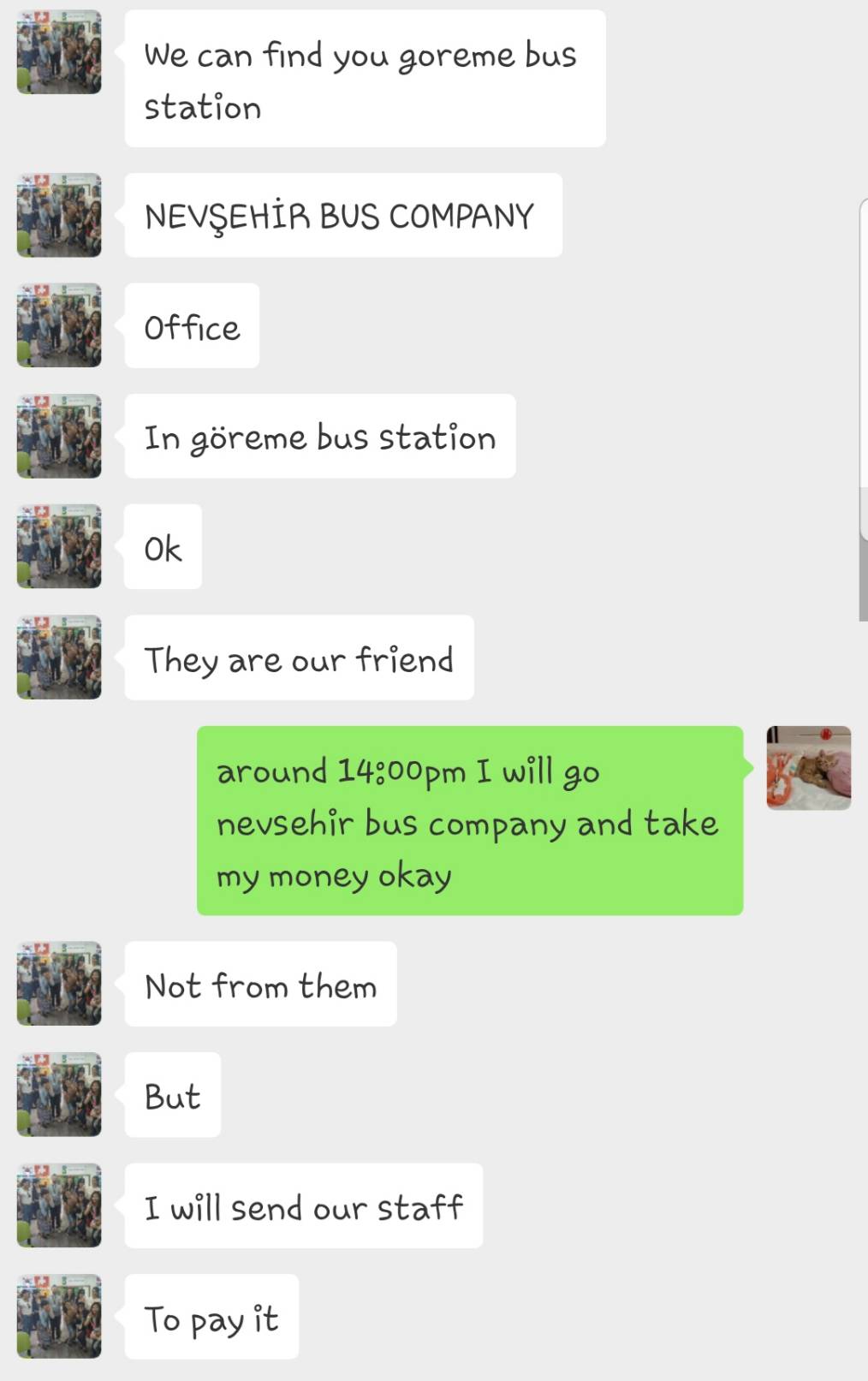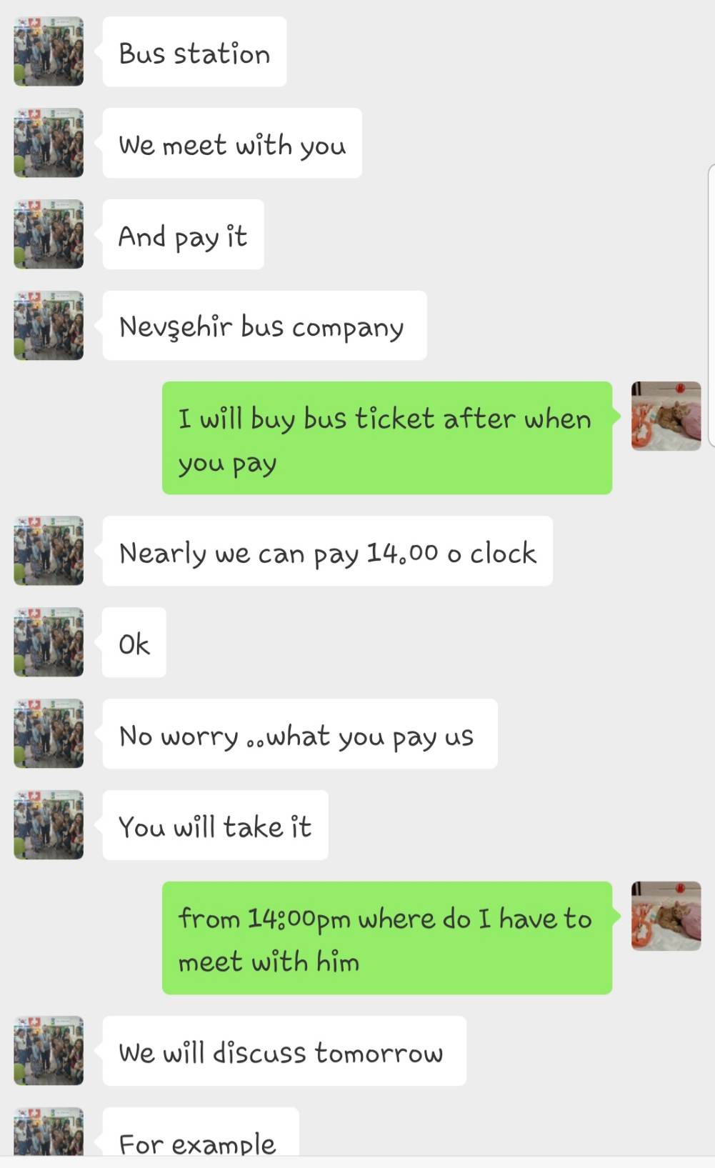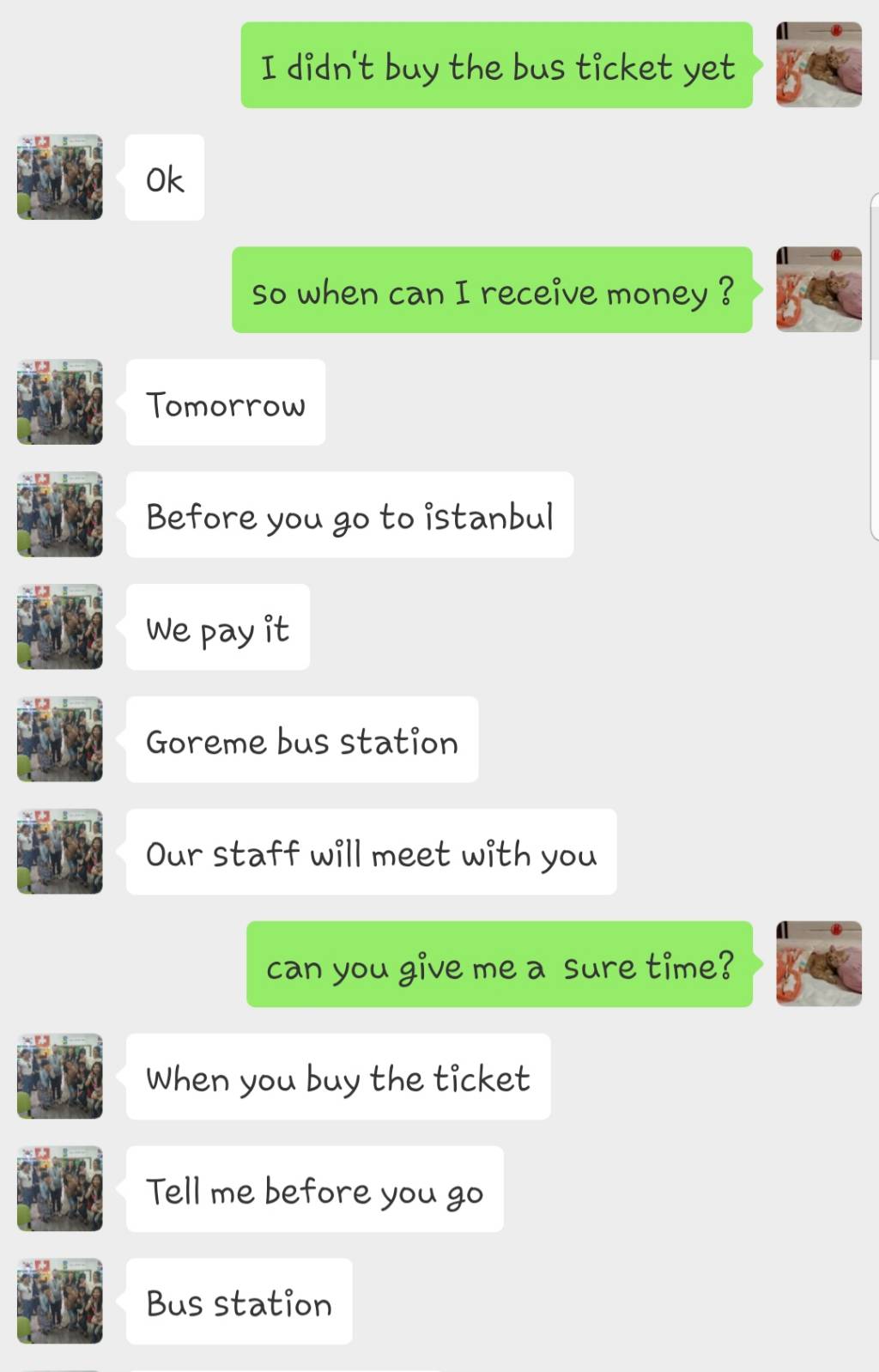 旅館主人一直在旁邊幫我想如何回覆對方,直接告訴對方我還沒買車票,直到他還錢了,我再去買車票往伊斯坦堡, 於是約了隔天下午2點要在巴士站拿錢
