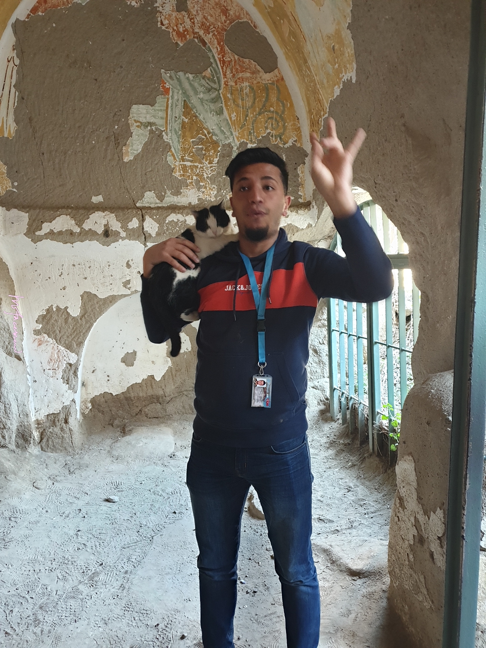 導遊先是在入口處一個洞穴教堂向大家講解,突然一隻賓士黑白貓過來, 導遊順勢將他抱起來繼續講解,(這畫面好可愛~❤)
