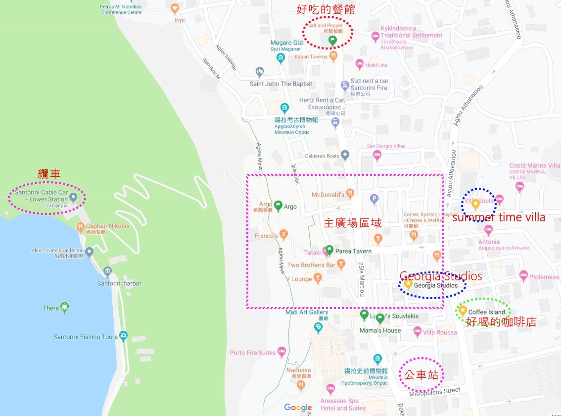 (2) Georgia Studios :屋主熱情(我一到旅館時女主人正在煮早餐,就分了一塊炸雞給我吃XD)、房間空間也不小,內有自助廚房,Fira市中心,離local bus 巴士站超近