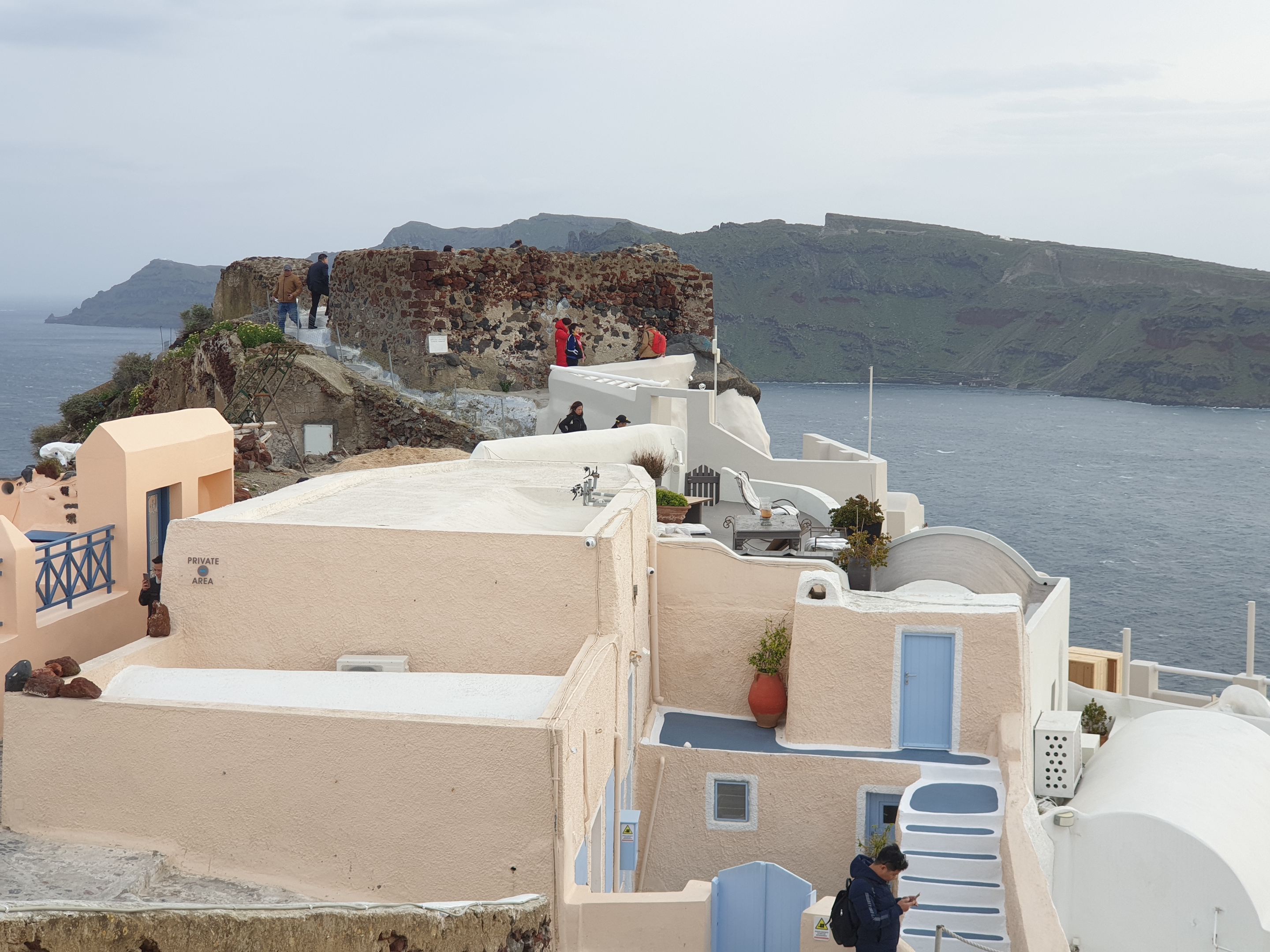 搭公車時,會發現聖托里尼的房屋其實全部是蓋在懸崖上,我在島上5天經歷過風很強的日子,這些 房屋仍不會被風吹倒, 希臘的真的是建築技術很強!(不過這不是泥土或沙子本質的懸崖,倒是不用擔心土石流)