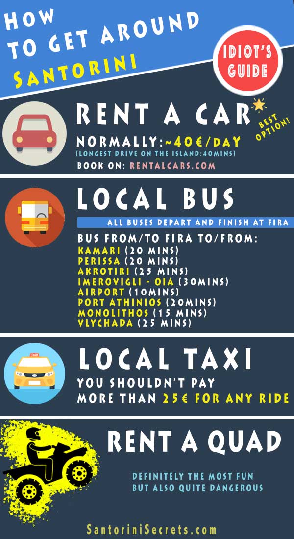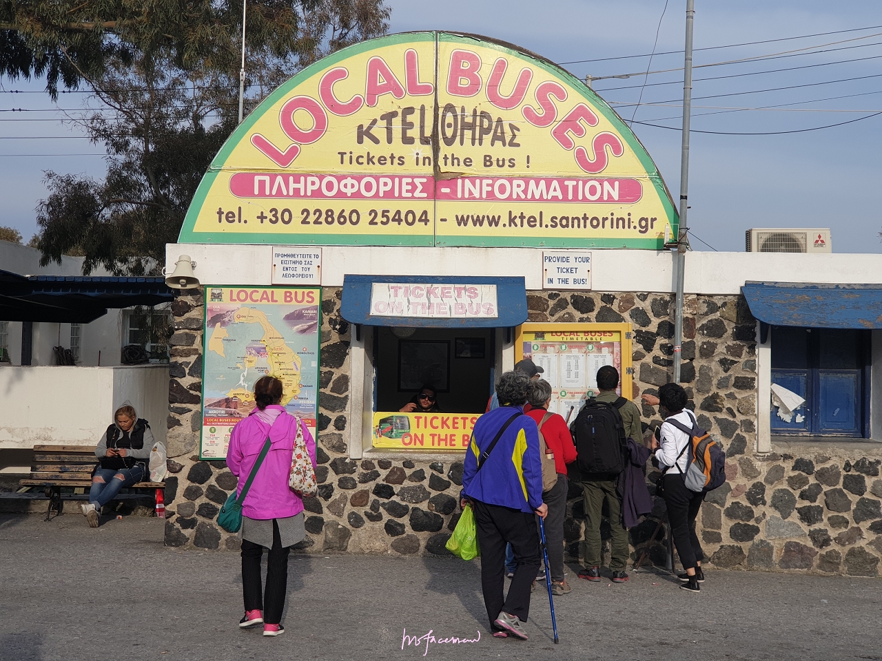 在Fira有很多汽機車出租店,不過我下午4點想要租機車時,每家店都跟我說NO!我以為是機車被租光了,後來才理解是他們都要下班了,所以如果想租機車建議早點去租,雖然我沒租到機車,但還好我有在Fira找到local buses公車站,而且Fira搭公車到Oia單程只要1.8歐,比租機車20歐便宜很多,且班次為一小時一班,會根據日落時間調整最後一班公車的時間,不過如果要看最美夕陽還是要等到日落後15分鐘最恰當(租機車是最方便移動)